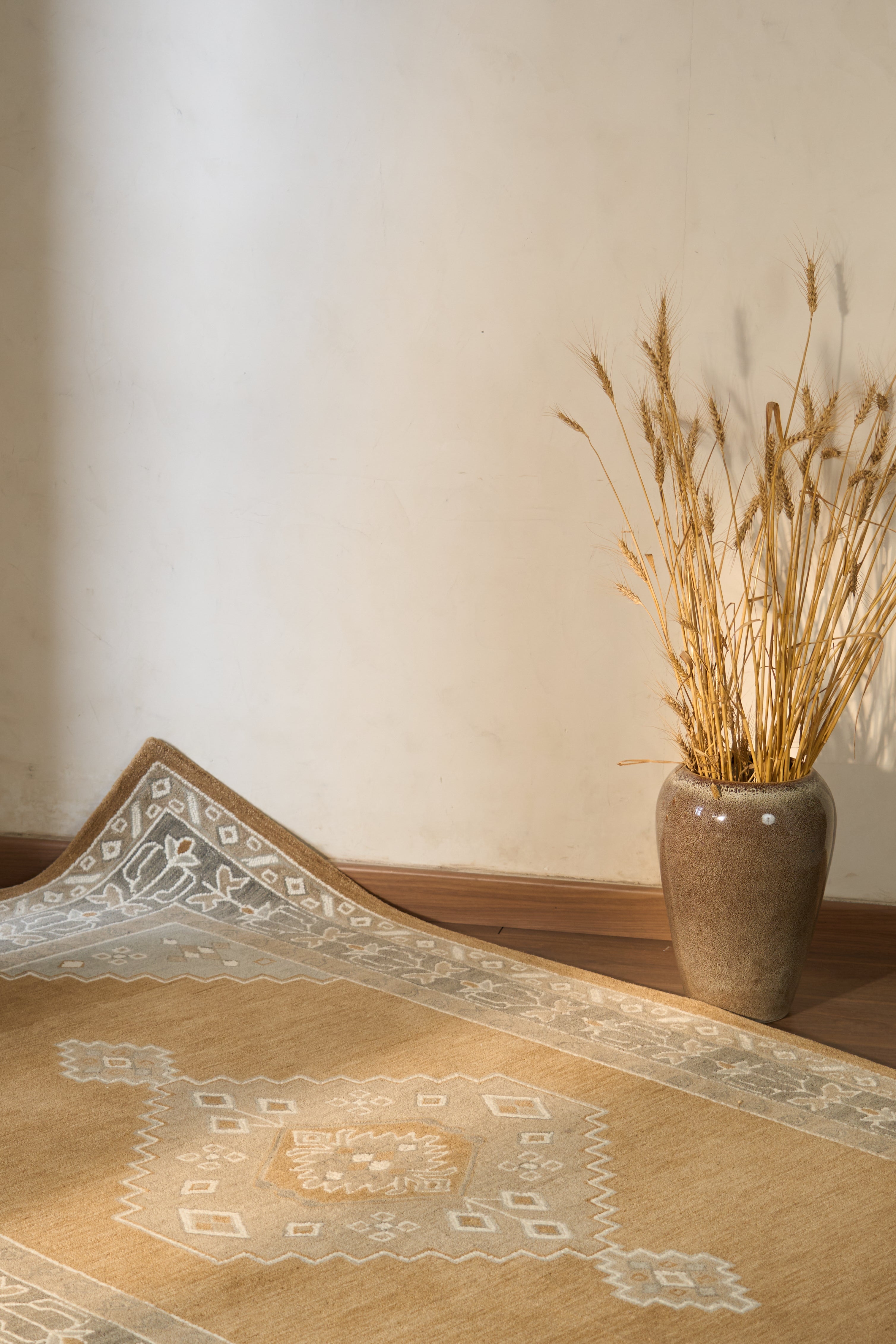 Elevate your space with this exquisite handwoven rug, where craftsmanship meets sophistication. Featuring a warm beige palette with intricate patterns, it seamlessly blends into any décor, adding a touch of understated luxury. Soft underfoot and crafted with the finest materials, this rug is not just a statement piece but a testament to timeless artistry. Perfect for creating cozy, elegant interiors with a natural charm.